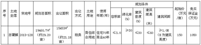 根據(jù)《中華人民共和國(guó)土地管理法》、《中華人民共和國(guó)城市房地產(chǎn)管理法》、國(guó)土資源部《招標(biāo)拍賣掛牌出讓國(guó)有建設(shè)用地使用權(quán)規(guī)定》等相關(guān)法律、法規(guī)規(guī)定, 經(jīng)古藺縣人民政府批準(zhǔn),受古藺縣國(guó)土資源局委托,古藺縣公共資源交易中心決定以拍賣方式出讓2013-128號(hào)地塊的國(guó)有建設(shè)用地使用權(quán)?,F(xiàn)將有關(guān)事項(xiàng)公告如下: